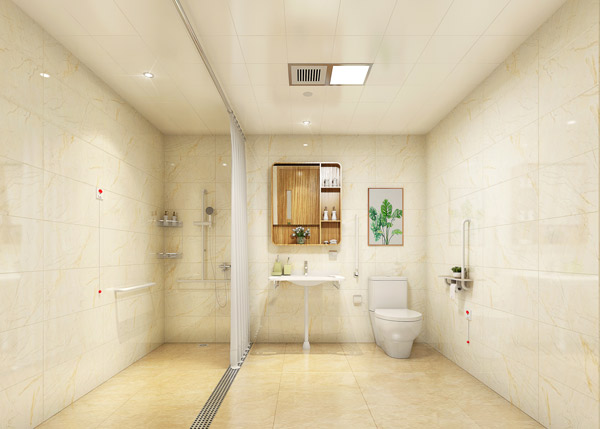超宽敞卫生间,方便长者自由进出;采用解水槽代替传统的玻璃隔断,保障长者的健康安全。
