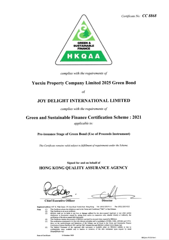 Yuexiu Property continues to benchmark against ever-improving international standards and best practices, referring to the voluntary guidelines Green Bond Principles (2025), Social Bond Principles (2025) and Sustainability Bond Guidelines (2021) by the International Capital Market Association (ICMA), as well as the Green Loan Principles (2025) and the Social Loan Principles (2025) by the Loan Market Association (LMA), Asia Pacific Loan Market Association (APLMA) and the Loan Syndications and Trading Association (LSTA) to set up Yuexiu Property’s Sustainable Finance Framework.