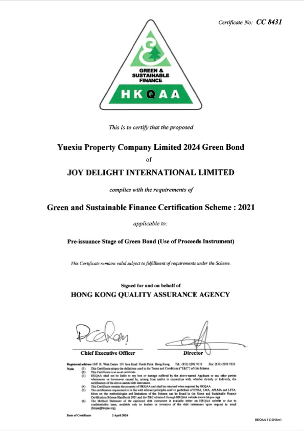 In order to effectively integrate the concept of sustainable development into various dimensions of business development so as to promote ESG works steadily and comprehensively, Yuexiu Property set up a Sustainable Finance Framework for the first time in 2024. This framework was updated in 2025 in line with market developments, which is planned to continue financing projects, assets and developments in line with Yuexiu Property's sustainability vision and strategy through sustainable financing transactions.