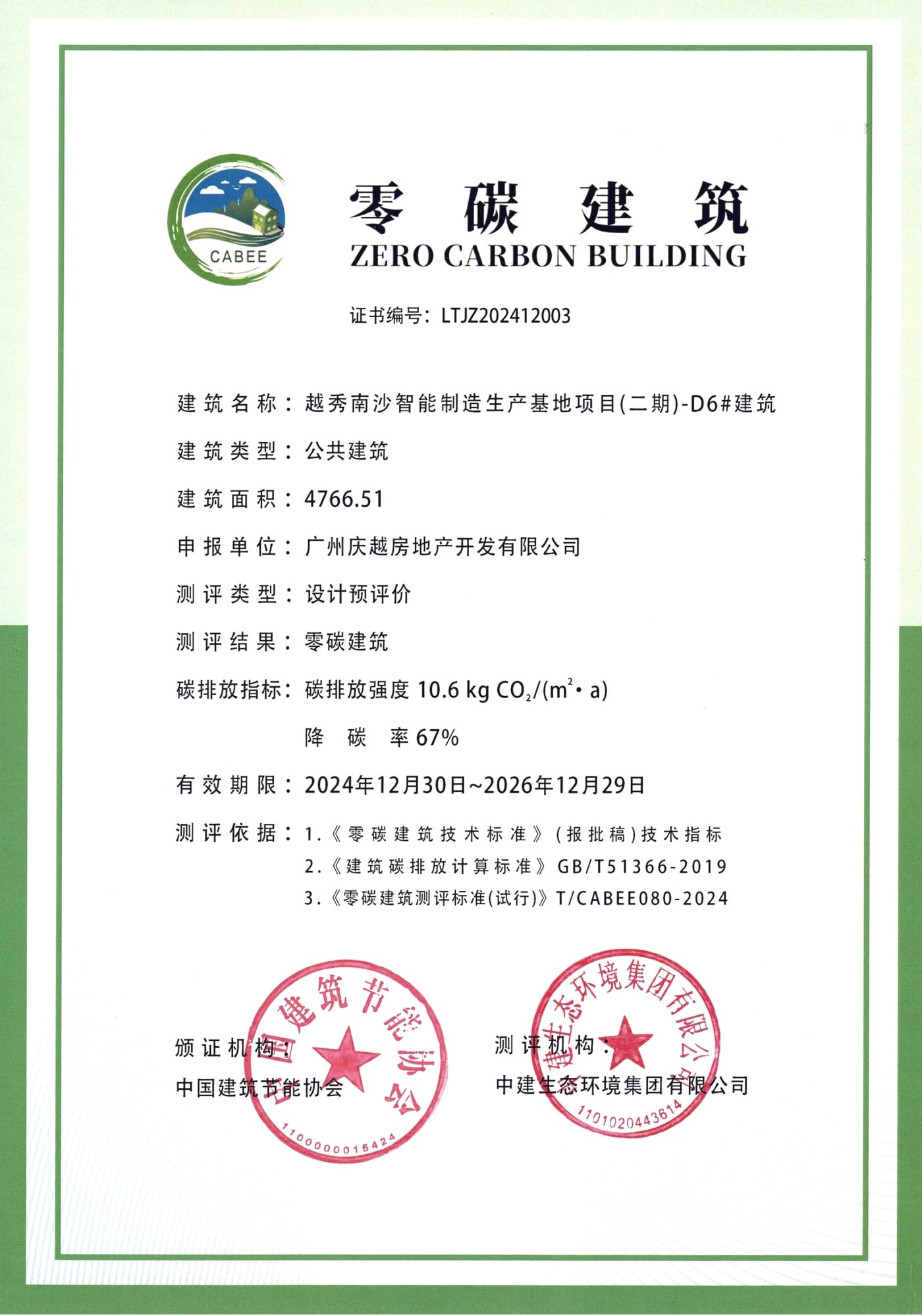 and successfully passed the zero-carbon and zero-energy building standards issued by the China Building Energy Conservation Association (CBECA) in December 2024, which is the first zero-carbon industrial park building in Guangzhou, and the first to obtain the daul-zero” certification in South China, marking that Yuexiu Property has taken the lead in promoting the development of zero-carbon and zero-energy buildings, and has stepped up to a new level in green construction.