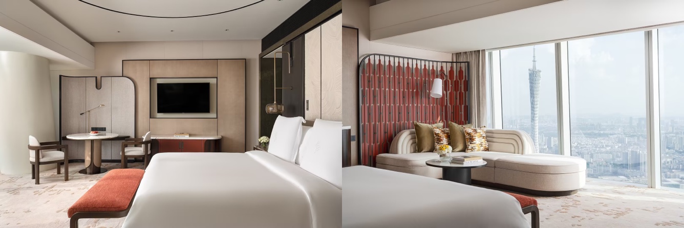 Inside the guest rooms, with the traditional wok-handle-shaped ceiling providing a screen for artistic display, and the Guangdong-style window lattices borrowed for use in the light fixtures, traditional symbols and modern aesthetics are perfectly married in the intelligent living space. The custom-designed artistic furnishings are inspired by Cantonese porcelain and olive pit carving, both Intangible Cultural Heritage, all features enabled by technological systems behind the scene, allowing Lingnan craftsmanship to shine through in silence. At the touch of the smooth lacquer and gaze of the translucent enamel, guests can immerse themselves in the profound cultural heritage—that is not merely a space renewed, but a civilized dialogue that brings back treasured memories of the past.