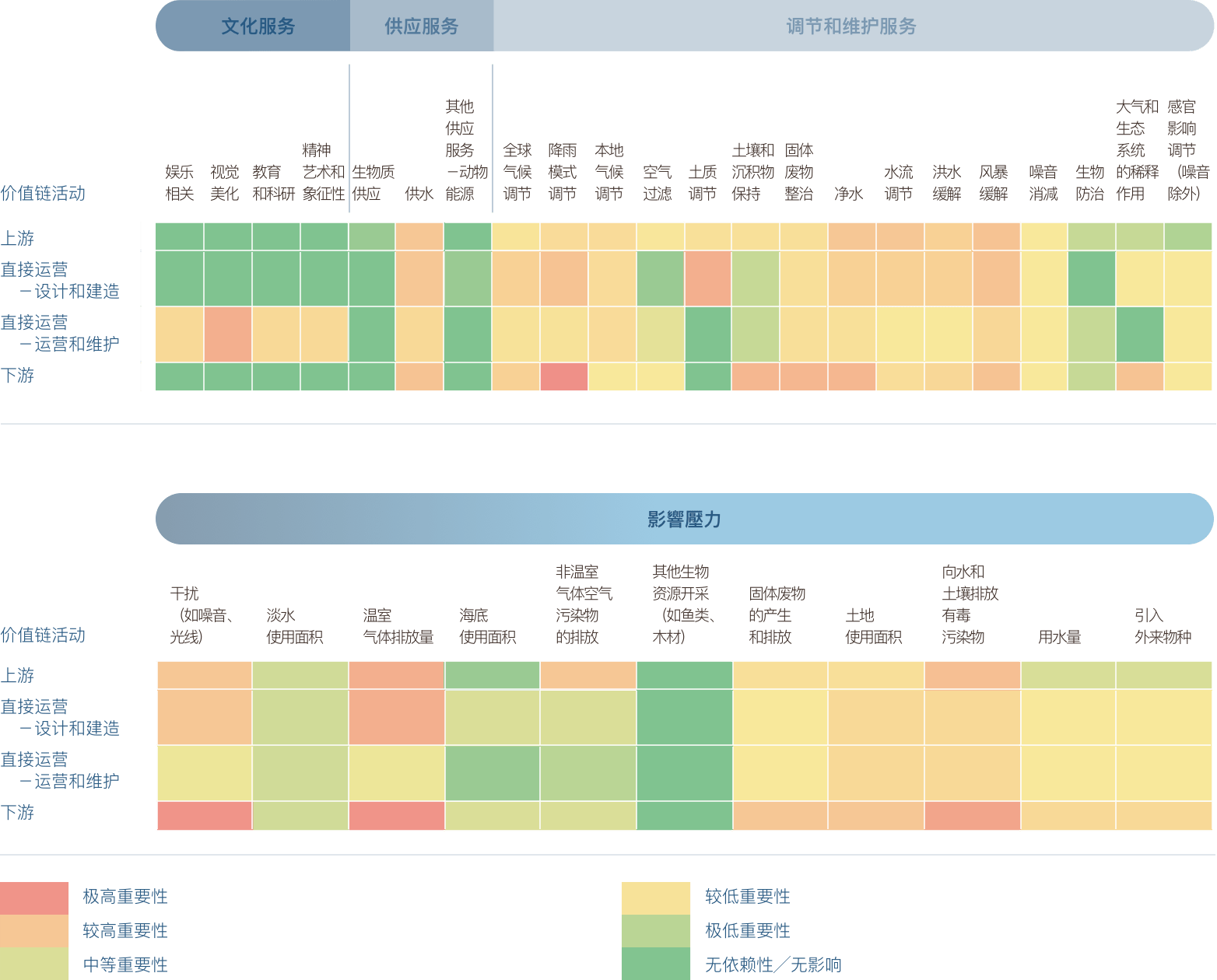 2024年,依据TNFD推荐框架,草榴社区 已经完成了对全价值链和10个重要项目城市的生物多样性评估。在价值链覆盖层面,我们系统性应用LEAP方法论,对草榴社区 在短期、中期及长期运营周期内的自然相关依赖与影响开展分析。草榴社区 不仅评估了业务活动的直接生态足迹,更将分析边界延伸至上下游的全生命周期。通过多维度分析,已建立包含考虑22个依赖自然的主题和11个影响自然的主题的监测体系。