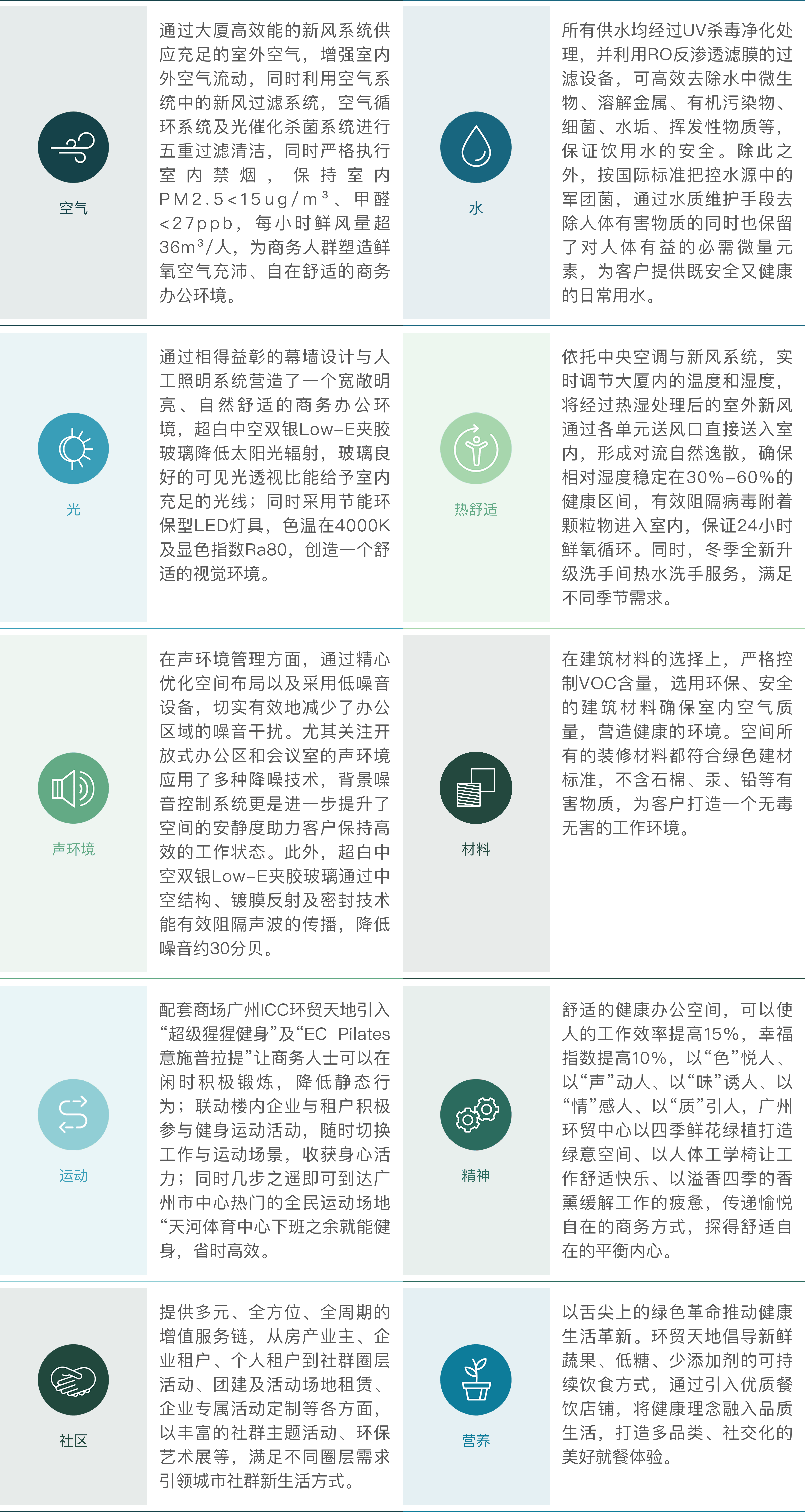 以广州环贸中心为例,作为同时拥有铂金级WELL认证和WELL HSR的商办资产,其通过多维重塑健康空间,构建了健康办公生态;通过以人为本共创可持续生活,丰富多元社群体验。广州环贸中心在WELL健康建筑标准的十大维度中的具体实践如下: